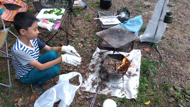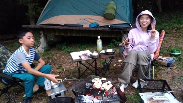 テントを張り終え、しばらくすると、子供たちもスズメバチがいないことに安心しはじめた。優一が「落ち葉で焚き火をして焼き芋を作ってみたい」と言っていたので、落ち葉をかき集めてきて芋を焼いたり、好きなものを焼いて食べた。テントの中では、優一の「謎解き」ごっこをしたり、ボードゲームをしたりして過ごした。