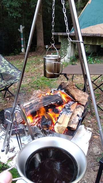 翌日の朝、早起きして一人で焚き火とコーヒーを楽しむ私