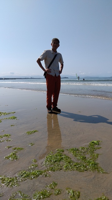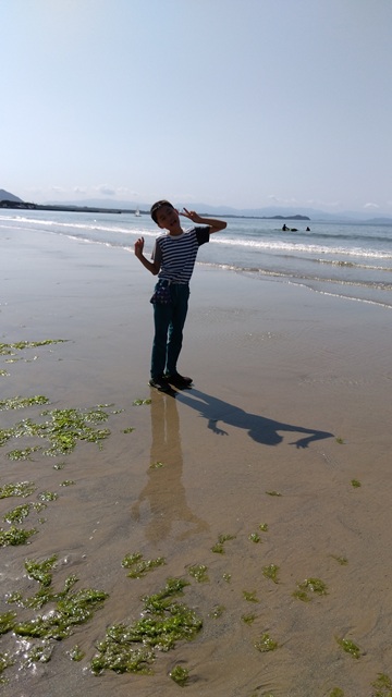 帰り道、近くの海が「かがみの海」であることを知り、寄り道した。ちょうど、土曜日の朝日小学生新聞で「ウユニ塩湖」に行った気分になれると紹介されていた。せっかくだからと、波が引いた海の上に立ち、優一に写真を撮ってもらったところ、顔から下しか映してくれなかった。現象にしか興味がないらしい。サチコに撮りなおしてもらい、それらしい写真が撮れた。