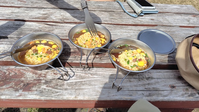 山頂に行ってしまうと、そこからトイレのあるキャンプセンターに行くには、鎖場の崖を通らなければならない。サチコが鎖場は怖いということで、山頂には行かず迂回してキャンプセンターに行き、そこでお椀用のインスタントラーメンを食べて、下山した。