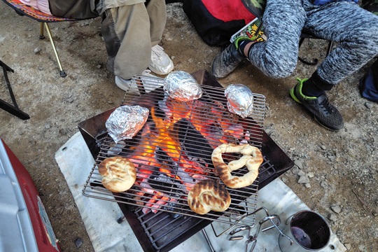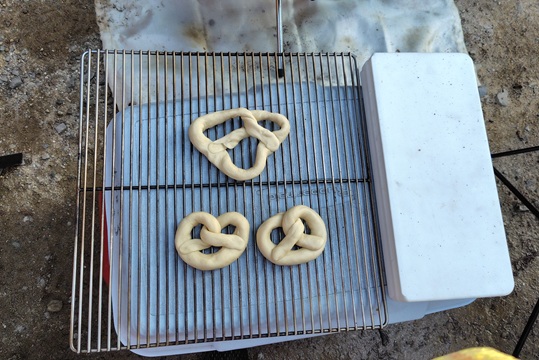 夜はいつものようにバーベキューをしたのだが、今回のキャンプの「めあて」は、ブレッツェルを作ることであった。いつもは、「巻き巻きパン」を作っているのだが、これの形状を変更し、ドイツの本格ブレッツェルを作ることにしていた。生地は、事前に準備しておき、キャンプ場で三等分して、私、サチコ、優一でブレッツェルの形にして、網で焼いた。